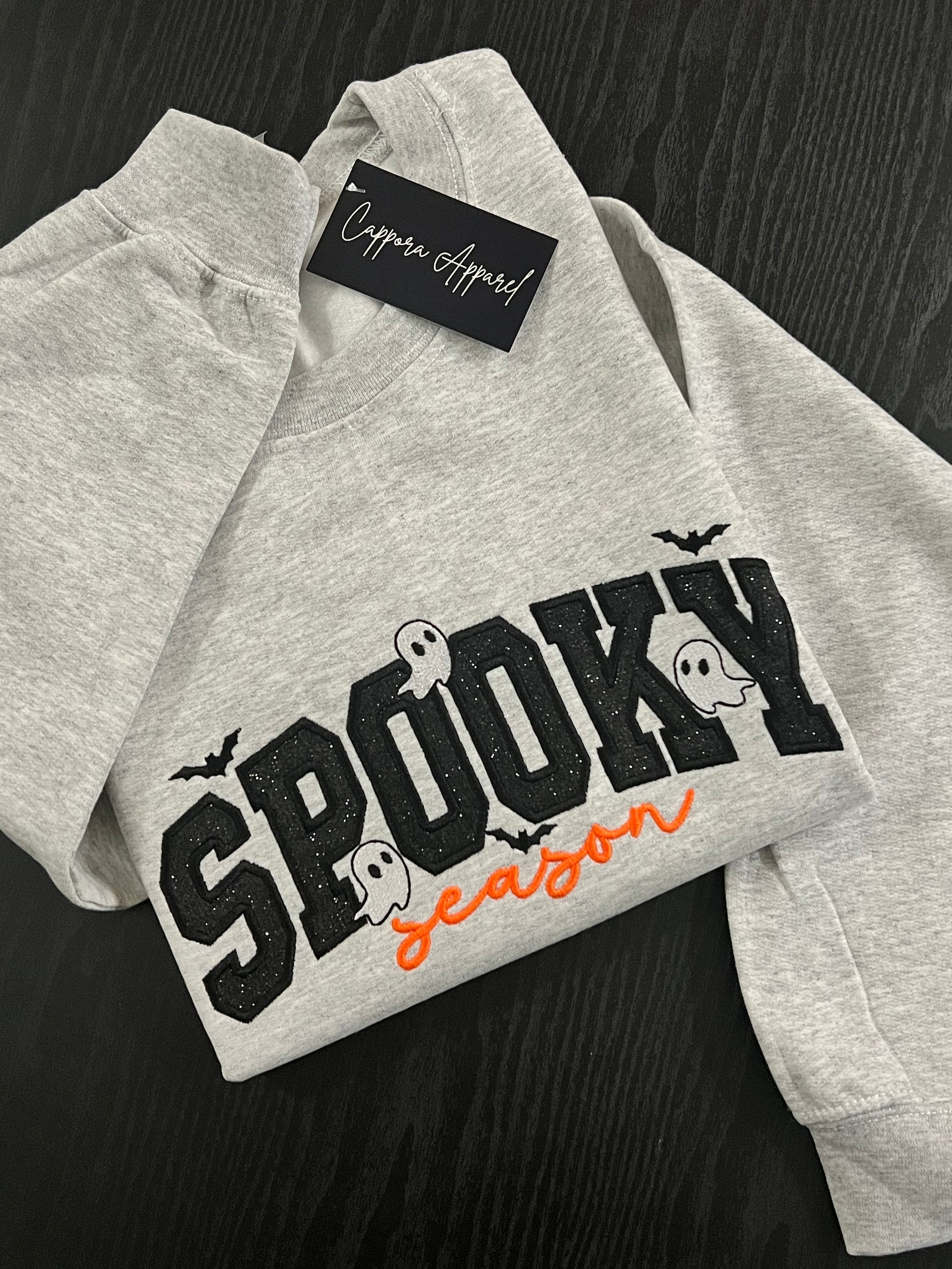 Spooky Season Applique Sweatshirt- Embroidered Glitter Ghosts & Bats Crewneck, Halloween Fall Graphic Gildan Sweatshirt